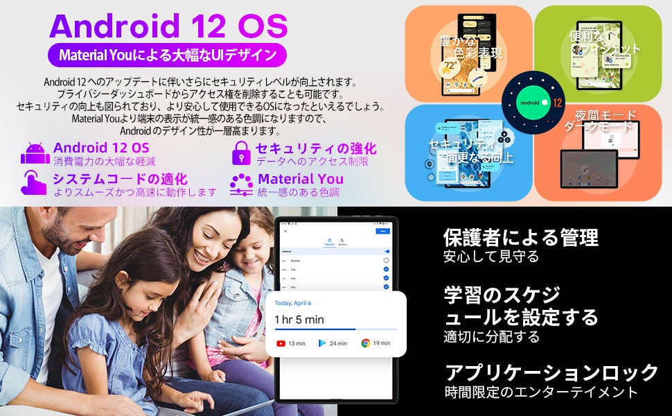 Teclastは、子供がタブレットの利用時間の長さおよびアプリの選択など、保護者の方々が悩んでいる問題点に対し、新しい子供の見守りアプリを開発しました。タブレットの使用時間やアプリの選択などの問題を効果的に管理することができ、学習と娯楽のより良いバランスを持たせます。7000mAhバッテリーが装備されており、Type-Cの充電をサポートしているため、終日接続できます。