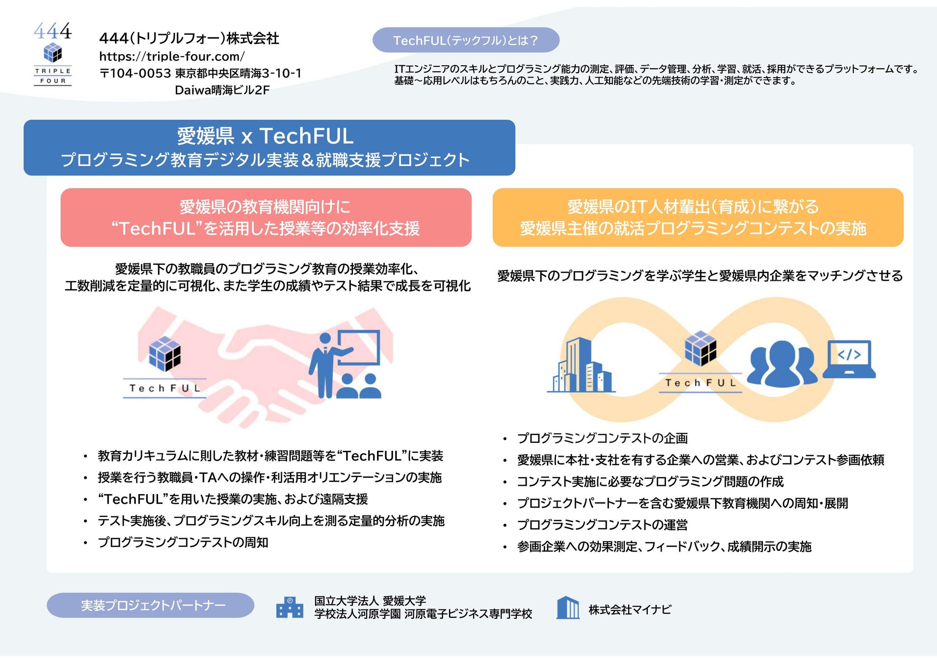 444株式会社(本社:東京都中央区、代表取締役社長:赤松 淳子)は、令和4年度愛媛県デジタル実装加速化プロジェクト「トライアングルエヒメ」の採択事業として、愛媛県下のIT人材育成・DX推進に向けて県内の教育機関・企業と連携し、プログラミング教育の効率化支援と、愛媛県で働きたい学生と県内企業をマッチングさせる就職活動直結型のプログラミングコンテストを2023年2月に実施します。