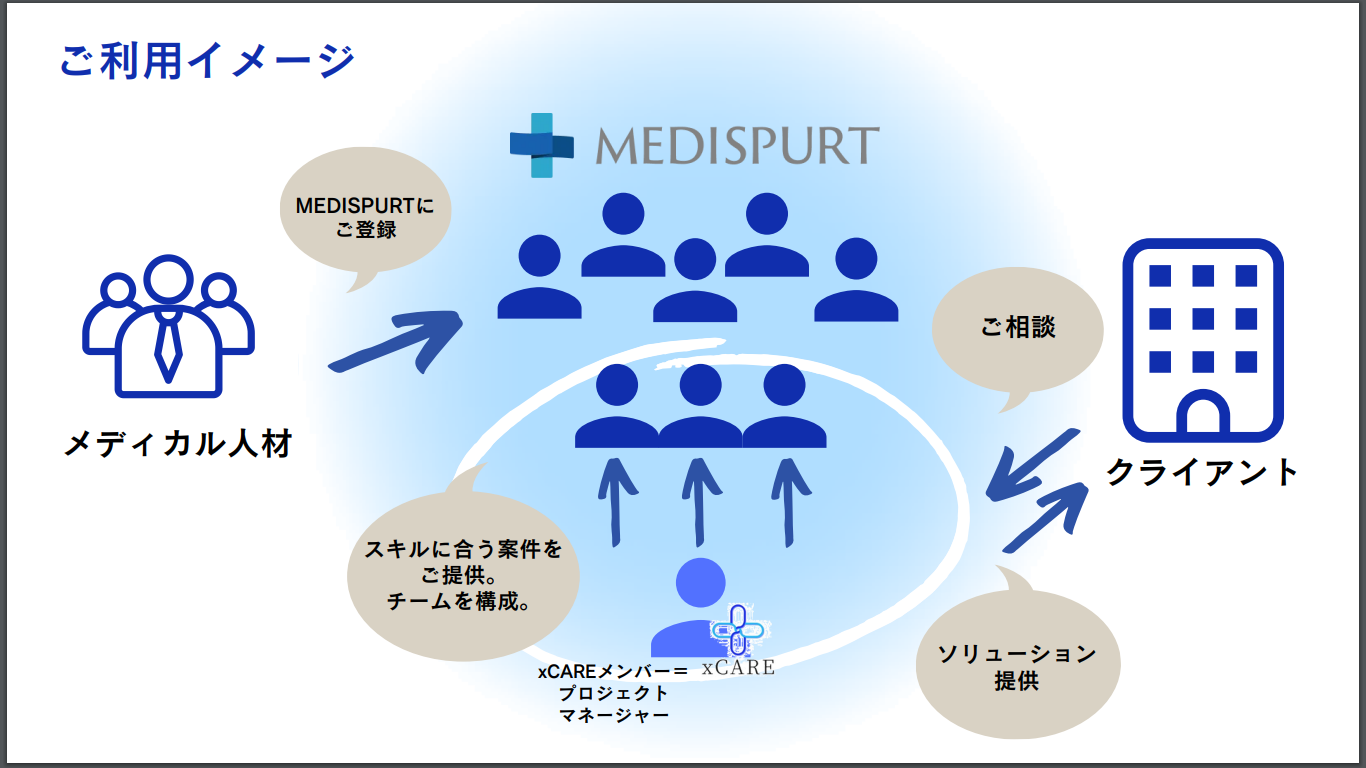 MEDISPURT(メディスパート )は、医療業界に特化したエキスパートプラットフォームです。質の良い医療プロダクトを⼀つでも多く世に出すことを⽬標に、主に国内外のバイオベンチャー、医療機器スタートアップにメディカル⼈材を活用した、「スポットプロジェクト」によるアウトソーシング、ハンズオンサポートを実施しております。(詳しくはプレスリリース10月へ→https://prtimes.jp/main/html/rd/p/000000002.000099309.html)