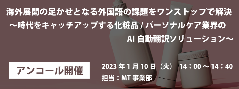 販売トレンドが百貨店からWebへと変わるなか、メンズコスメやハラールコスメといった新しい分野にも市場が拡大。そこで本ウェビナーでは、精度95%を誇るAI自動翻訳「T-4OO」とWeb会議を効率化する音声翻訳「オンヤク」の実演を交え、大きく様変わりする化粧品/パーソナルケア業界の海外展開を加速させるソリューションをお届けします。