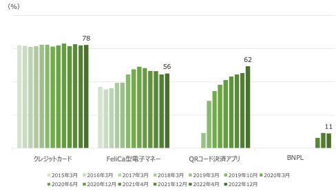 QRコード決済の利用率は、全体で62%と、前回調査(2022年4月)に引き続きFeliCa型電子マネーを上回る結果となり、クレジットカードに次ぐキャッシュレス手段として定着してきていることが見てとれました。