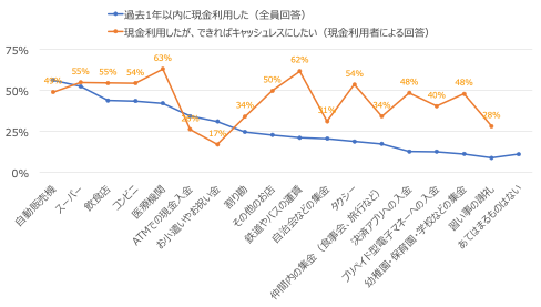 - 現金利用したがキャッシュレスで支払いたい決済は、「医療機関」(63%)が最も多く、次いで「鉄道やバスの運賃」(62%)。一方で、「お小遣いやお祝い金」や「自治会などの集金」は引き続き現金のニーズが高い傾向