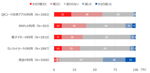 ■ QRコード決済は利用が増加したと回答した人は約50%。BNPLは40%