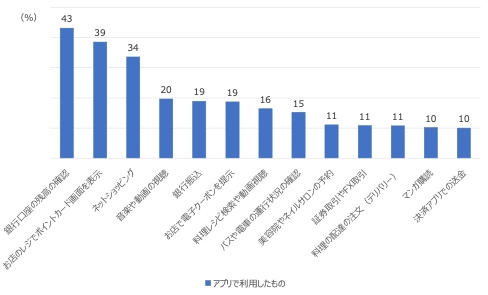 ■ アプリでの利用が多かったのは「銀行口座の残高確認」(43%)のほか、「銀行振込」(19%)「証券取引き・FX取引き」などの金融機能の利用が目立った