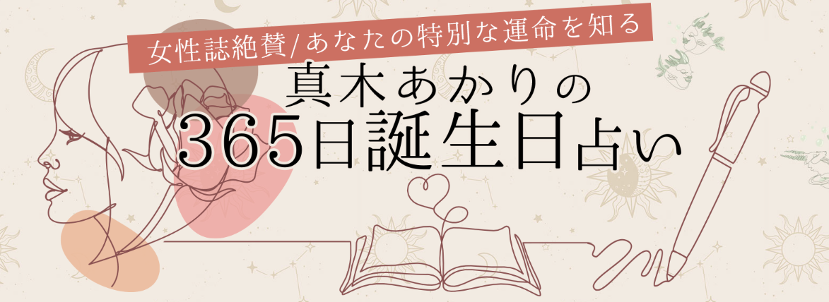 365日「あなたの誕生日」には、その日だけが持つ『特別なメッセージ』が込められています。本コンテンツでは、生まれた日ごとに異なる『あなただけの運命』を、女性誌でも大人気の鑑定士『真木あかり』が占います。「生まれた日」から割り出した「誕生日プロフィール」と「誕生日バイブル」から、あなたの運命を知り、あの人との絆を結び付け、願いを叶える鑑定を是非お試し下さい。