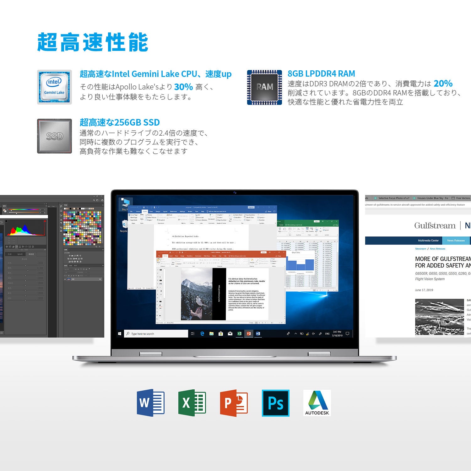 パソコンは新世代のプロセッサ インテル「Gemini Lake」N4120プロセッサ、14nmプロセスルール、4コア4スレッド、ベース周波数1.1GHz、最大ターボ周波数2.6GHz、Intel UHD Graphics 600 搭載、より高いクロック速度とより高速なGPU マルチタスク機能を備えた Web ブラウジング、作業効率の向上。