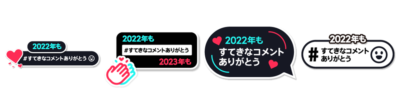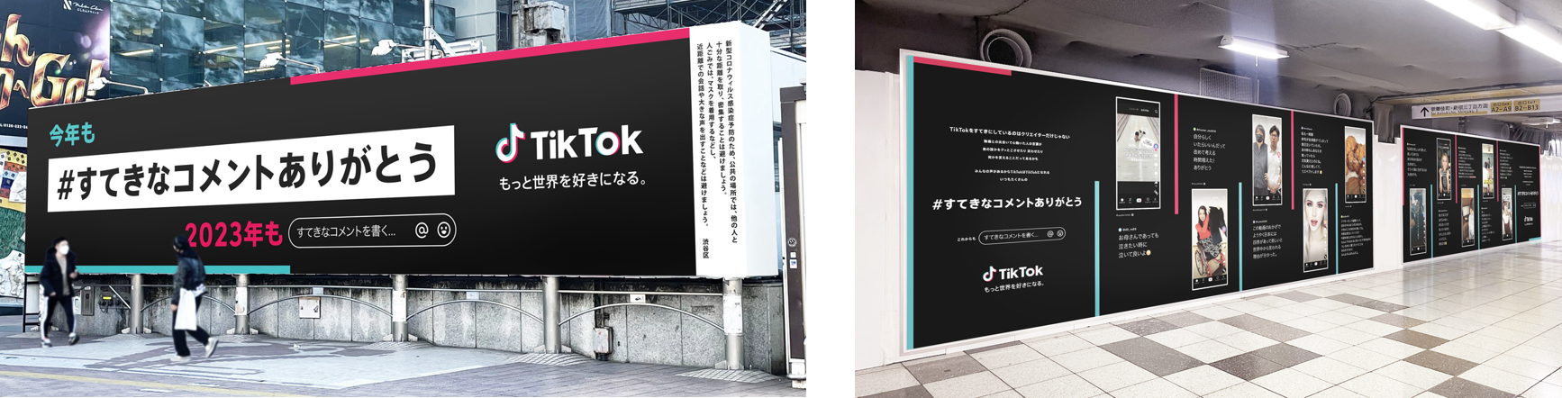 TikTokでは、創造的な表現ができ、楽しめるコミュニティ環境の維持に継続的に取り組んでいます。TikTokの楽しさの一つは、アイデアの共有やコメントによるつながりなど、コンテンツによる様々な人々との関わり合いです。TikTokは、TikTokユーザーの皆さんが互いをサポートし、ポジティブなコミュニティ環境を維持することを目指している中で、今年も非常に多くのユーザーの皆さんから沢山の素敵なコメントを投稿いただきました。TikTokの安心できるコミュニティは、クリエイターの皆さんだけでなく、ユーザーの皆さんから投稿される沢山の素敵なコメントにも支えられていることへの感謝を伝えるべく、2022年を締めくくる年末より屋外広告を実施してまいります。