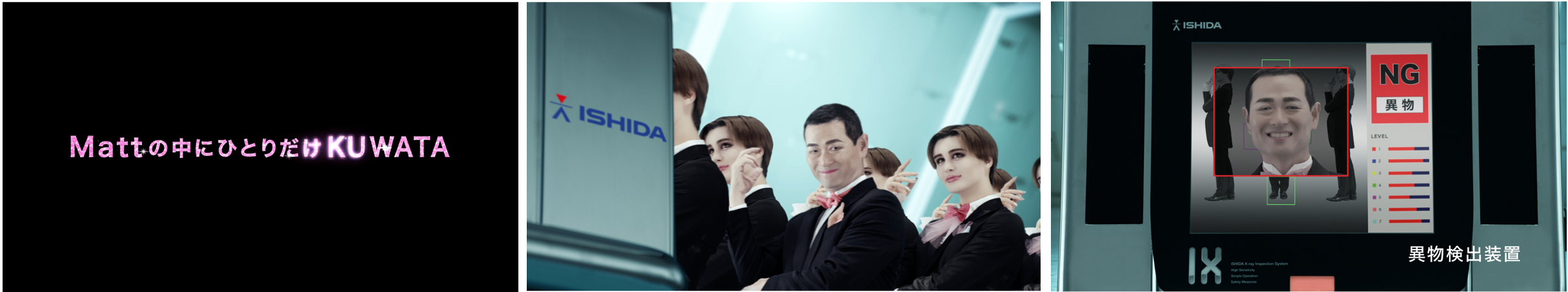 CM本編では、イシダの「はかりしれない技術」(検査装置)が、たくさんのMattさんの中に紛れ込んだ「Matt風メイク」の桑田さんを見つけ出してしまいます。検出時の桑田さんがこれまでに見たことのないリアクションに挑戦する姿は必見です。また、撮影の感想を伺うと桑田さんは「指導者として大切なのは「寄り添う」ということで、今日はMattに寄り添いながらメイクを受けてみました。」と、ここでしか見られない桑田さんの父としての姿が伝わるインタビュー映像にも注目です。