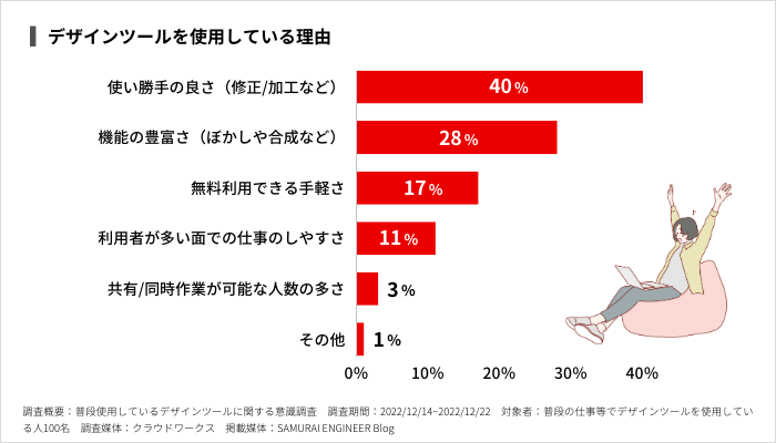 最後に「デザインツールを使用している理由」を聞いたところ、「使い勝手の良さ(修正/加工など)」と回答した人が40%、「機能の豊富さ(ぼかしや合成など)」と回答した人が28%、次いで「無料利用できる手軽さ」が17%、「利用者が多い面での仕事のしやすさ」が11%でした。