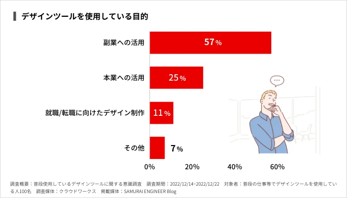 次に「デザインツールを使用している目的」を聞いたところ、57%の人が「副業への活用」と回答しました。また、25%の人が「本業への活用」、11%の人が「就職/転職に向けたデザイン制作」と回答しました。半数以上の人が副業への活用を目的にデザインツールを使用しています。