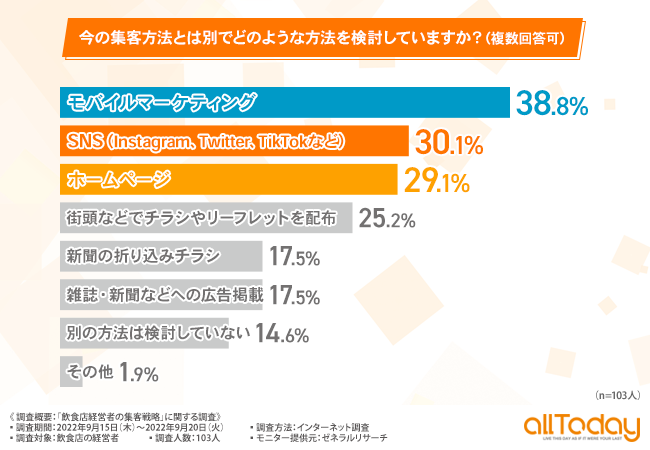 「今の集客方法とは別でどのような方法を検討していますか?(複数回答可)」と質問したところ、『モバイルマーケティング(38.8%)』と回答した方が最も多く、次いで『SNS(Instagram、Twitter、TikTokなど)(30.1%)』『ホームページ(29.1%)』と続きました。