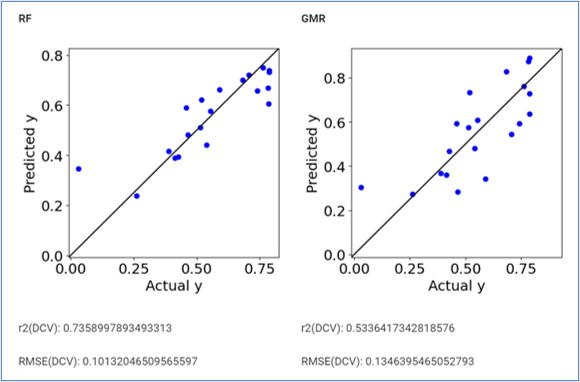目標性能に対する新規材料の作製条件を予測する場合、通常実験していないダミーの作製条件のサンプルを乱数などで大量に生成したものを別に用意する必要があります。そして、それらの作製条件全てに対し機械学習モデルを当てはめて予測し、予測結果の中から良好なものを選ぶというプロセスを経ます。一方本機能では、混合ガウス回帰(GMR)と呼ばれる機械学習モデルを用いてダミーサンプルを用意する必要なく、設定目標に対してそれを達成する確率の高い作製条件を直接予測してくれます。