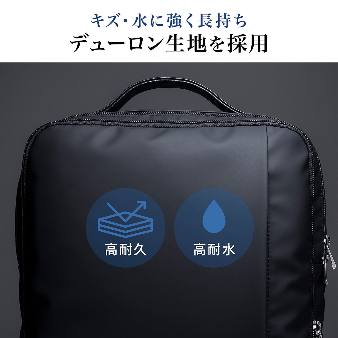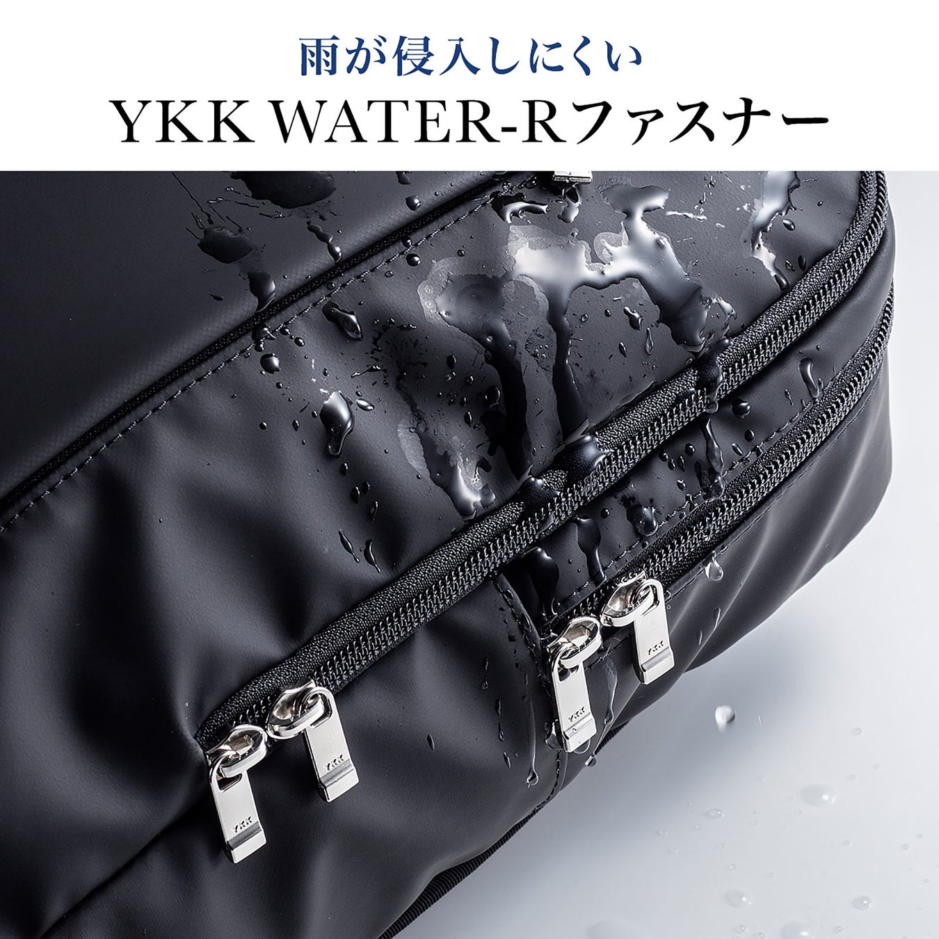 傷が付きにくく、水を弾くデューロン生地、雨が侵入しにくいYKK WATER-Rファスナーによって、突然の雨で荷物が濡れることを防ぎます。