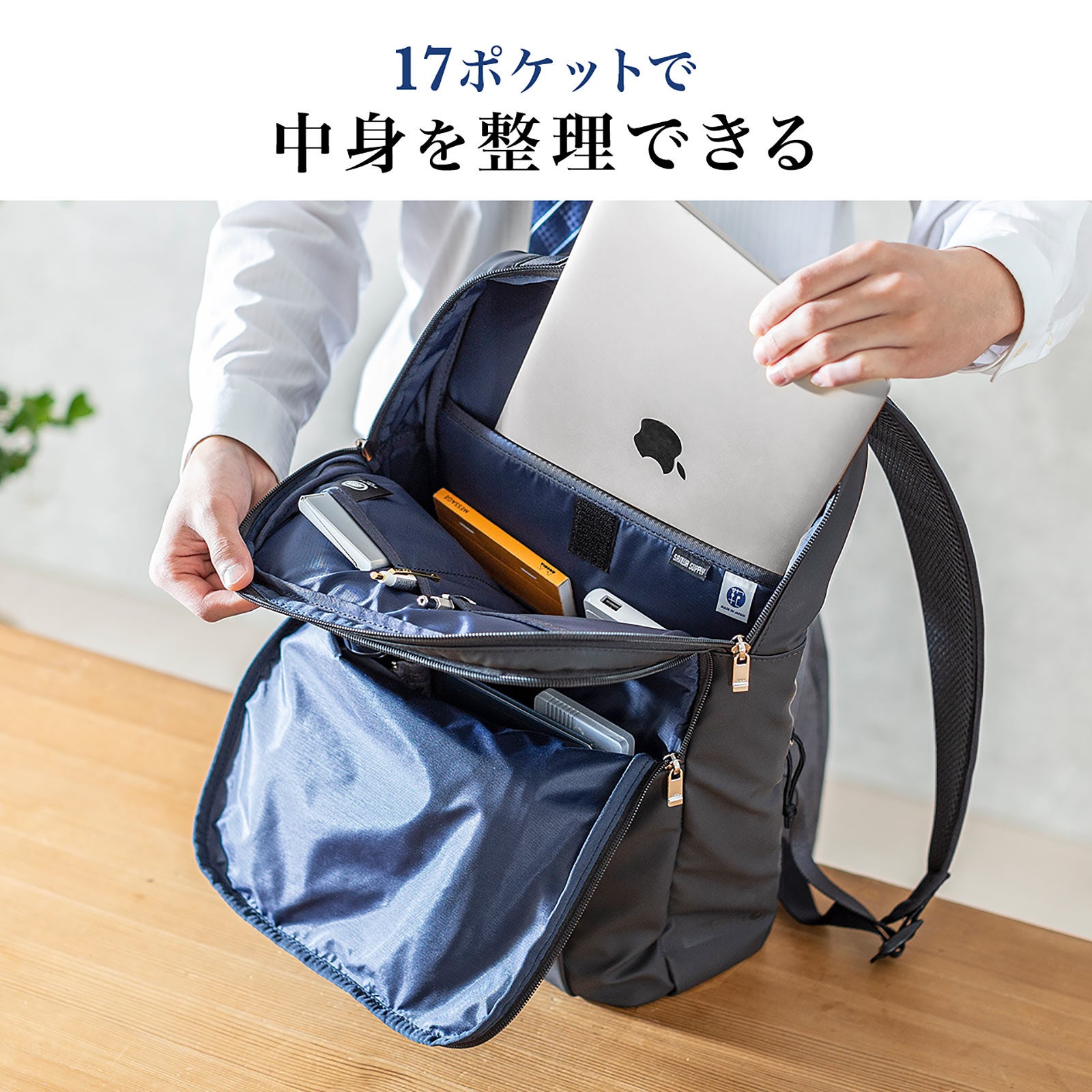 本製品は、毎日の通勤や仕事に安心して使える、耐久性と耐水性に優れた日本製の薄型ビジネスリュックです。