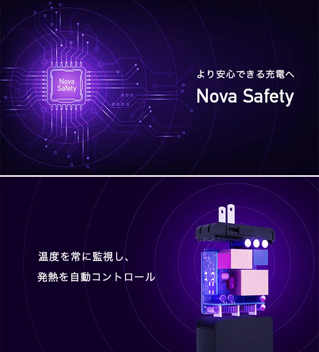 「Nova Safety」は『NovaPort TRIO 140W』に搭載された安全保護機能。温度を常に監視し、製品の発熱を自動調整します。温度管理を行うことでより安心して充電いただけることを目指しました。