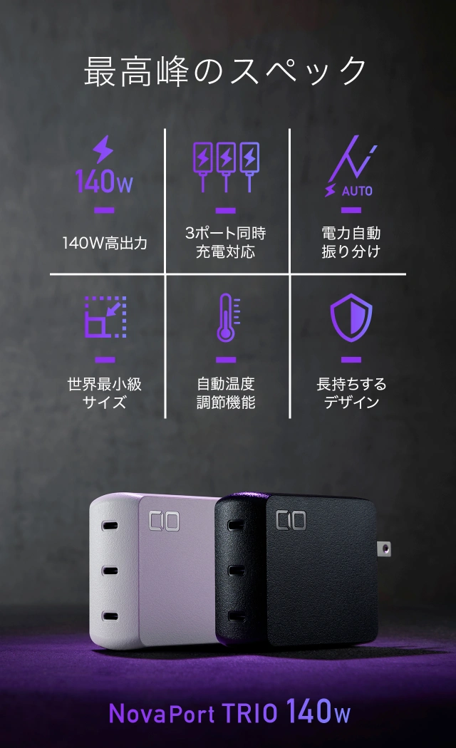 革新的な新技術を単に製品に実装するだけでなく、CIOの得意とする多機能性を組み合わせることで、CIO史上最高スペックの製品が誕生しました。それが『NovaPort TRIO 140W』です。