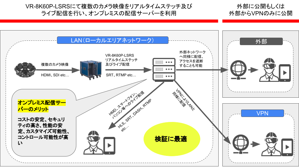 8KVRライブストリーミング配信の開発・検証に最適な8K60Pに対応したオンプレミス配信サーバーも提案いたします。オンプレミス配信サーバーのメリットは、コストの安定、セキュリティの高さ、性能の安定、カスタマイズ可能性、コントロール可能性が特長です。アプリケーションのインストールやハードウェア・ソフトウェアのカスタマイズを行ったり、サーバー管理を自分で行うことができます。VPNの対応も可能です。