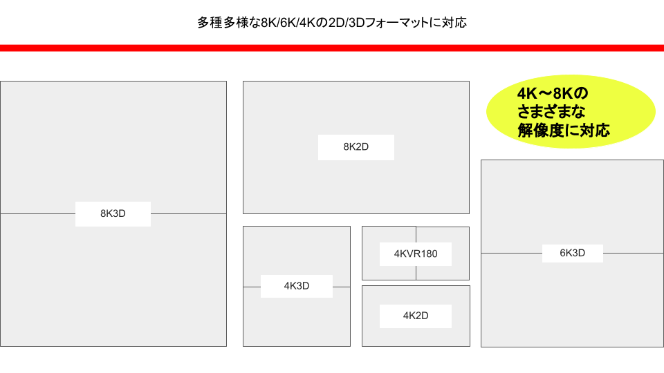 多種多様な8K/6K/4Kの2D/3Dフォーマットに対応します。8192×8192、8192×4096、7680×7680、7680×4320、7680×3840、5760×5760、5760×3840、4096×4096、4096×2160、4096×2048、3840×3840、3840×2160、3840×1920に加え、オリジナルの解像度を設定することも可能です。※映像の入出力、プロトコル、出力形式、配信サービスの組み合わせにより解像度及びフレームレートに上限が発生いたします。