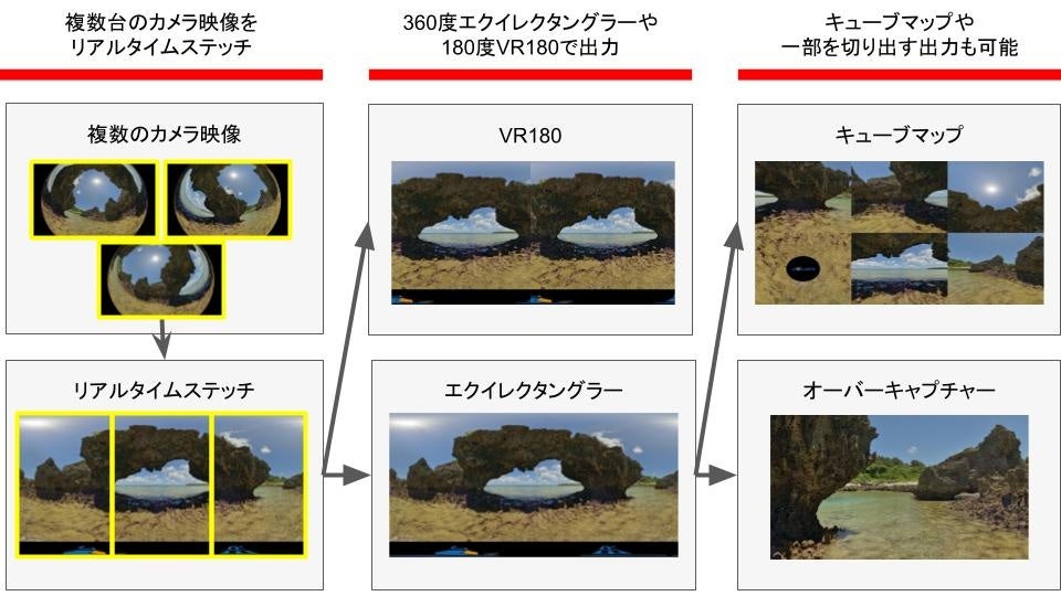 複数台のカメラ映像をリアルタイムでステッチ及びエクイレクタングラー形式に変換補正を行い、VR映像としてライブストリーミング配信できます。さまざまなカメラやレンズを組み合わせて利用することができます。