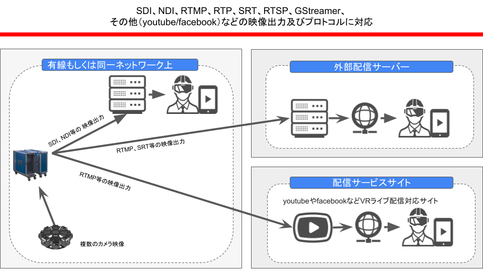 1台から複数台の高解像度カメラ映像をリアルタイムでVR映像に変換しVRライブストリーミング配信を行うシステムです。4K~8Kのカメラ映像入力に対応し、最大8K60PのVR映像(エクイレクタングラー等)としてVRライブストリーミング配信できます。