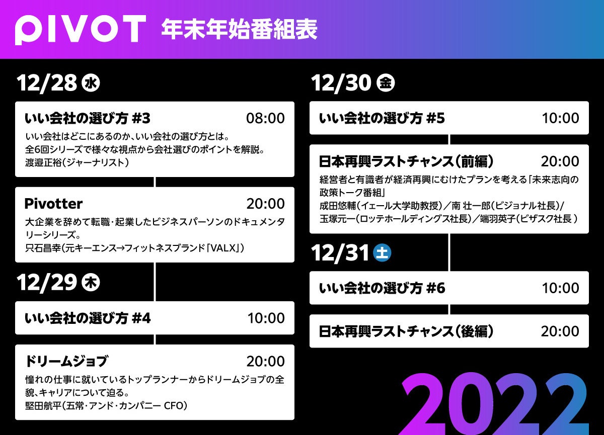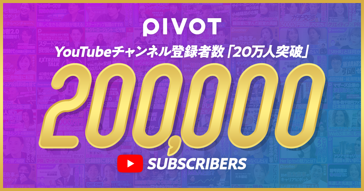 PIVOTは、映像番組を軸としたビジネス映像メディアです。新時代のマインドセットとスキルセットを高める映像・活字コンテンツを毎日無料で配信しています。令和を代表する起業家、ビジネスパーソン、クリエイターなどのコンテンツを深く早くお届けします。