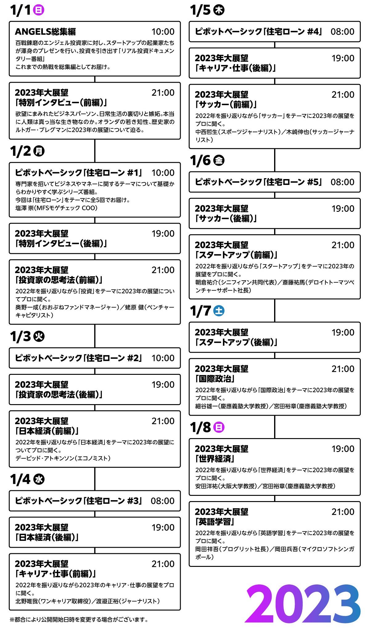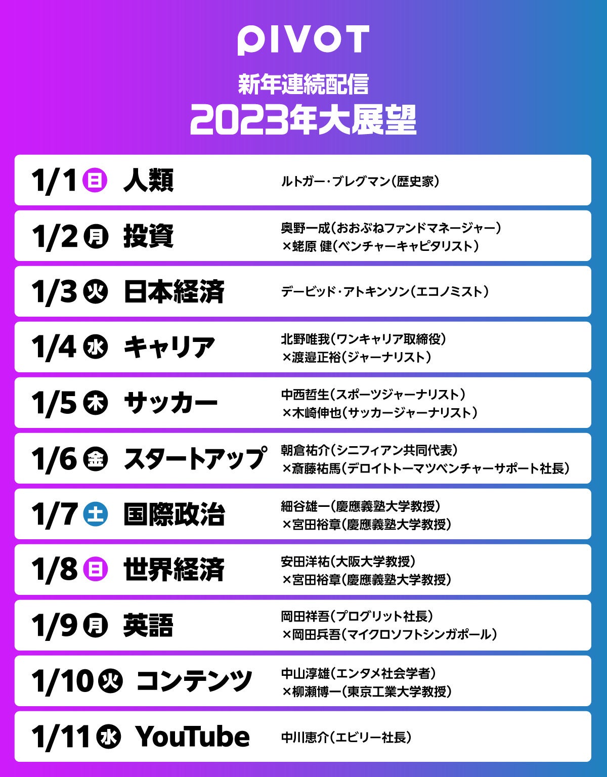 2023年の世界、日本経済、スタートアップ、YouTubeなどのコンテンツビジネスはどうなるのか。2022年を振り返り、2023年のビジネスを成功させるために、世界や日本のトップレベルの有識者に展望を聞く。2023年1月1日から11日連続配信。他では見られない、深い学びとなるシリーズ。
