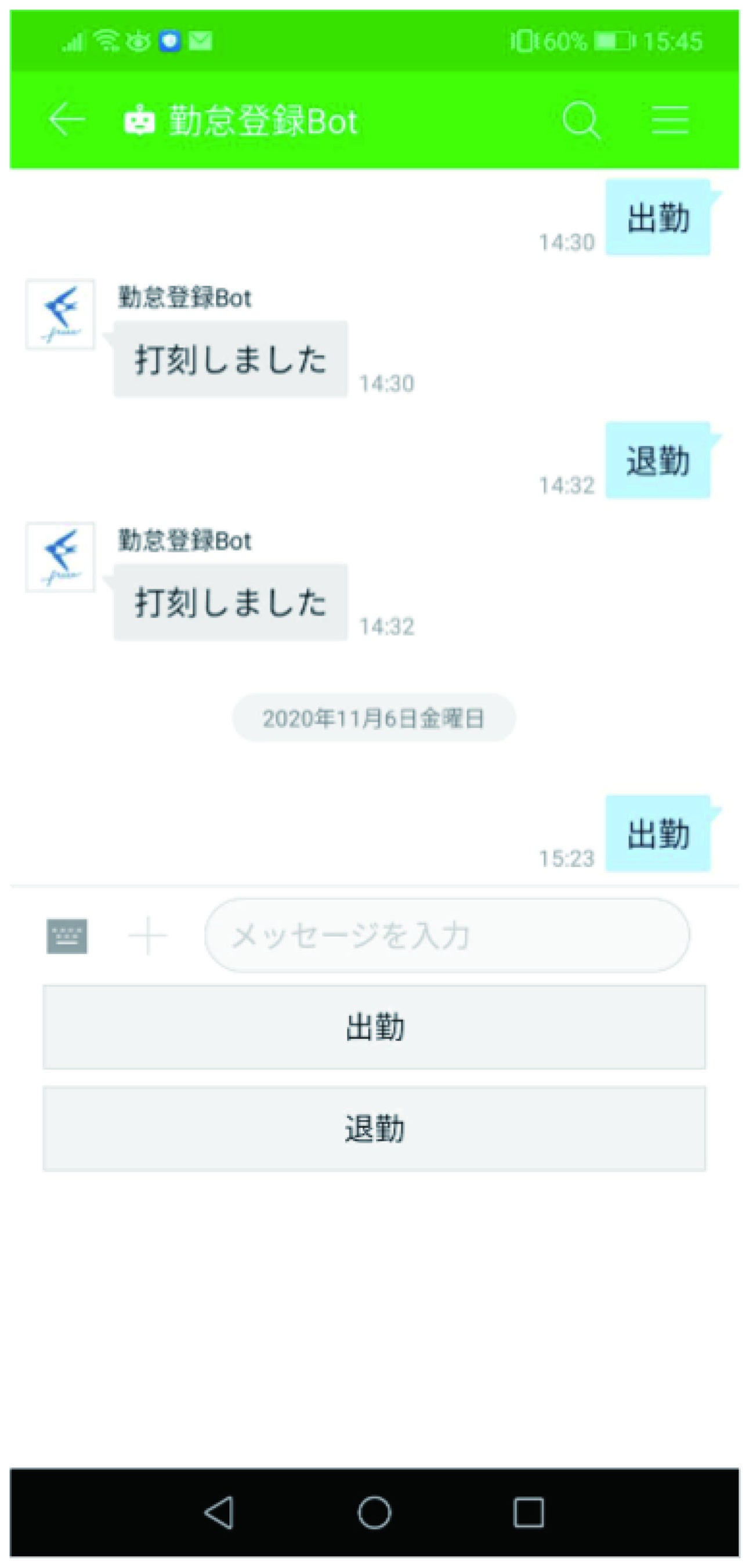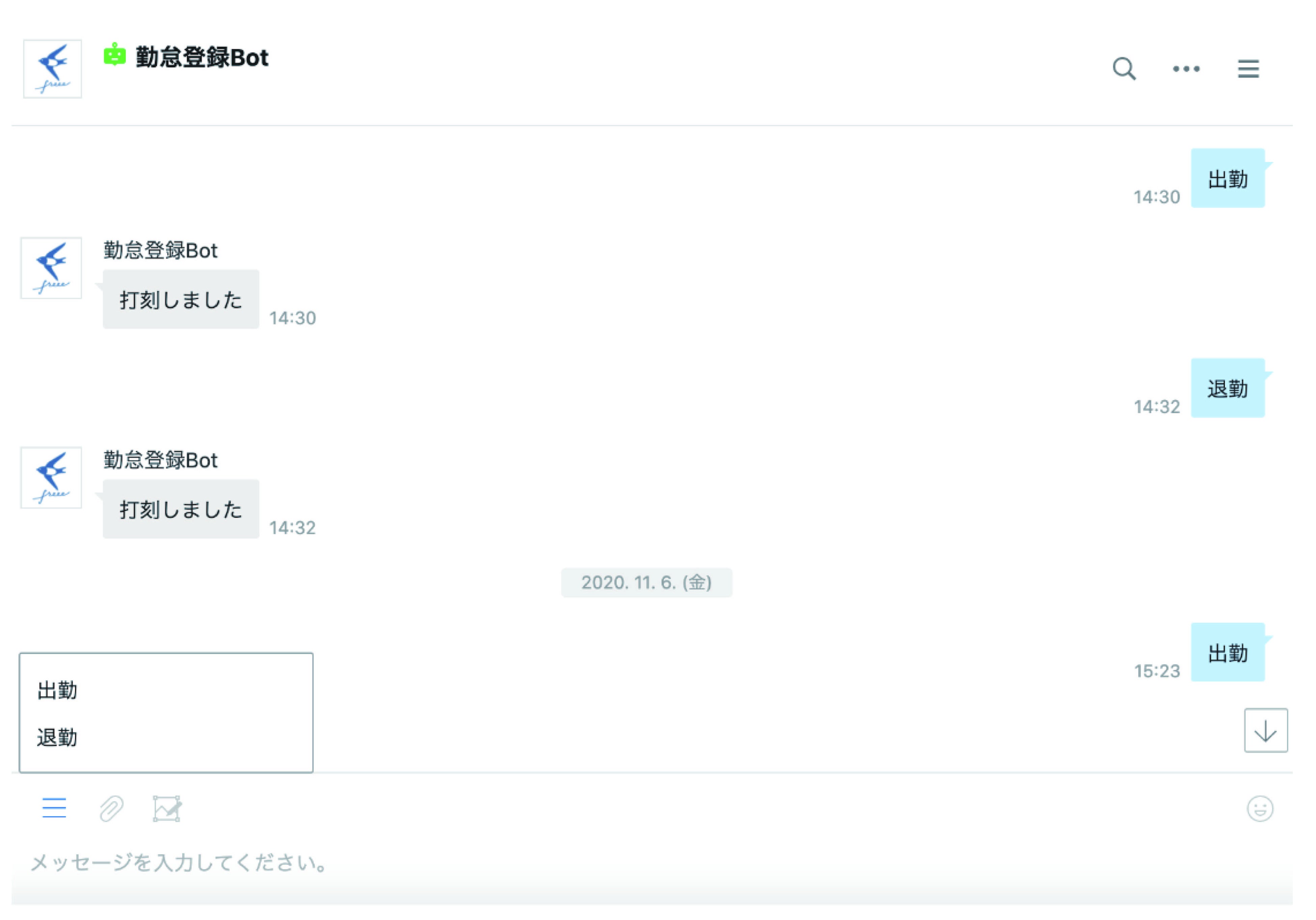 「LINE WORKS x freee人事労務勤怠Bot連携」は機能連携を活用することで、LINE WORKS上のBotからfreee人事労務に勤怠打刻ができるアプリです。メッセージ画面に表示される「出勤」「退勤」ボタンをタップするだけで打刻が完了します。スマホ・タブレットのワンタッチ操作で、いつも使っているLINE WORKSから勤怠打刻ができるため営業先・現場への直行直帰時の勤怠管理も簡単になります。