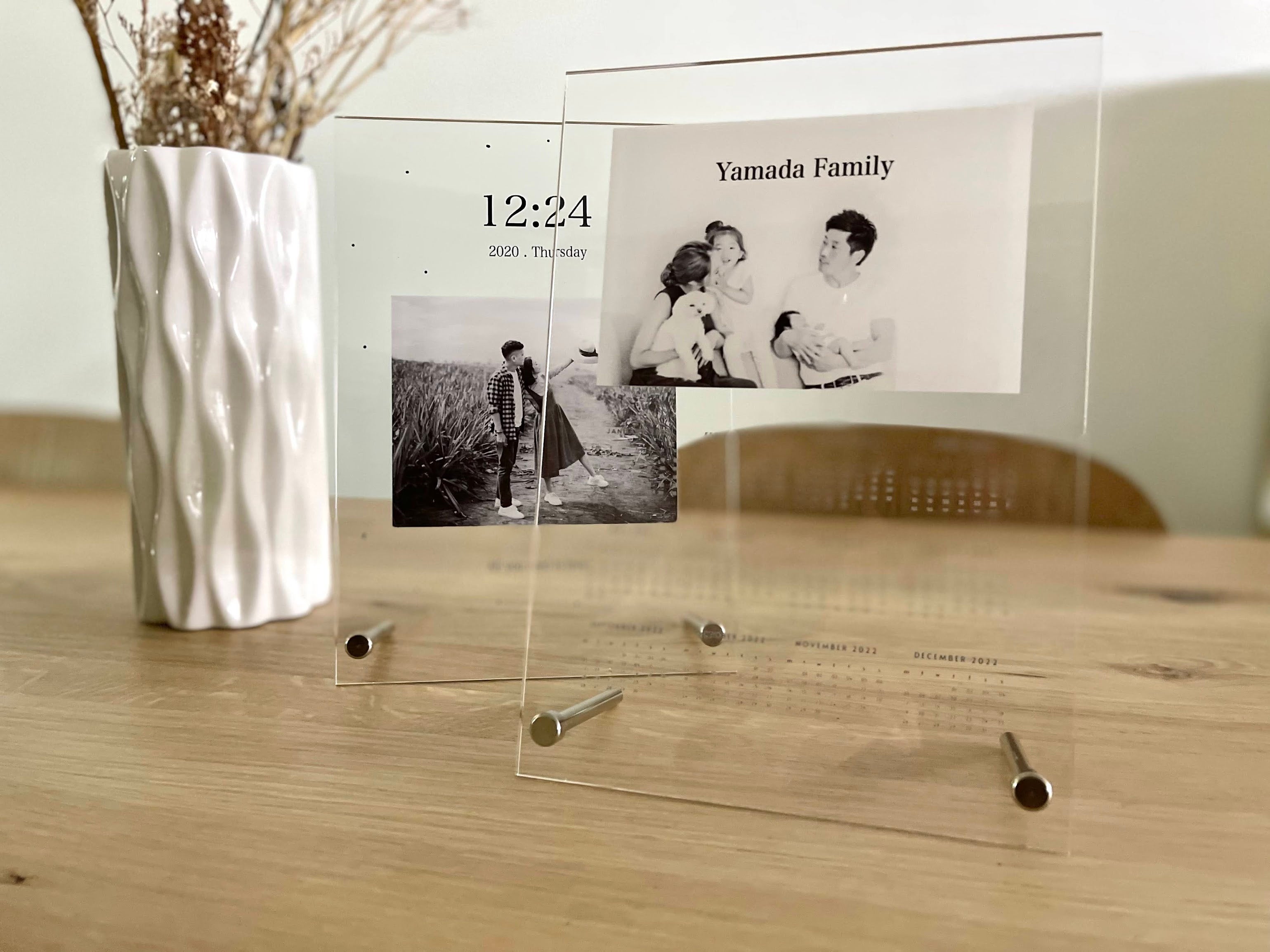 オリジナルで作成頂けるアクリル時計は、立て掛けでも壁掛けでもお好きな場所にお飾りください。