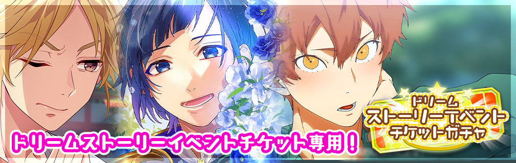 ドリームストーリーイベントチケットは、「★5【お互いの願いが叶った瞬間】柴崎愛蔵」「★5【僕だけのジュリエッタへ】染谷勇次郎」「★5【1%しか可能性がなくても】南」がピックアップされた『ドリームストーリーイベントチケットガチャ』で使用することができます。