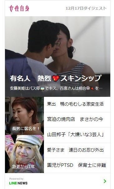 「WEB女性自身」のLINE公式アカウントでは、毎週火曜・木曜・土曜の20時20分に編集部が厳選したオススメ記事8本をユーザーにお届け。芸能スクープや皇室記事、生活実用情報などを配信し、友だち追加数は242万人を突破。多くのLINEユーザーから支持を得ています。