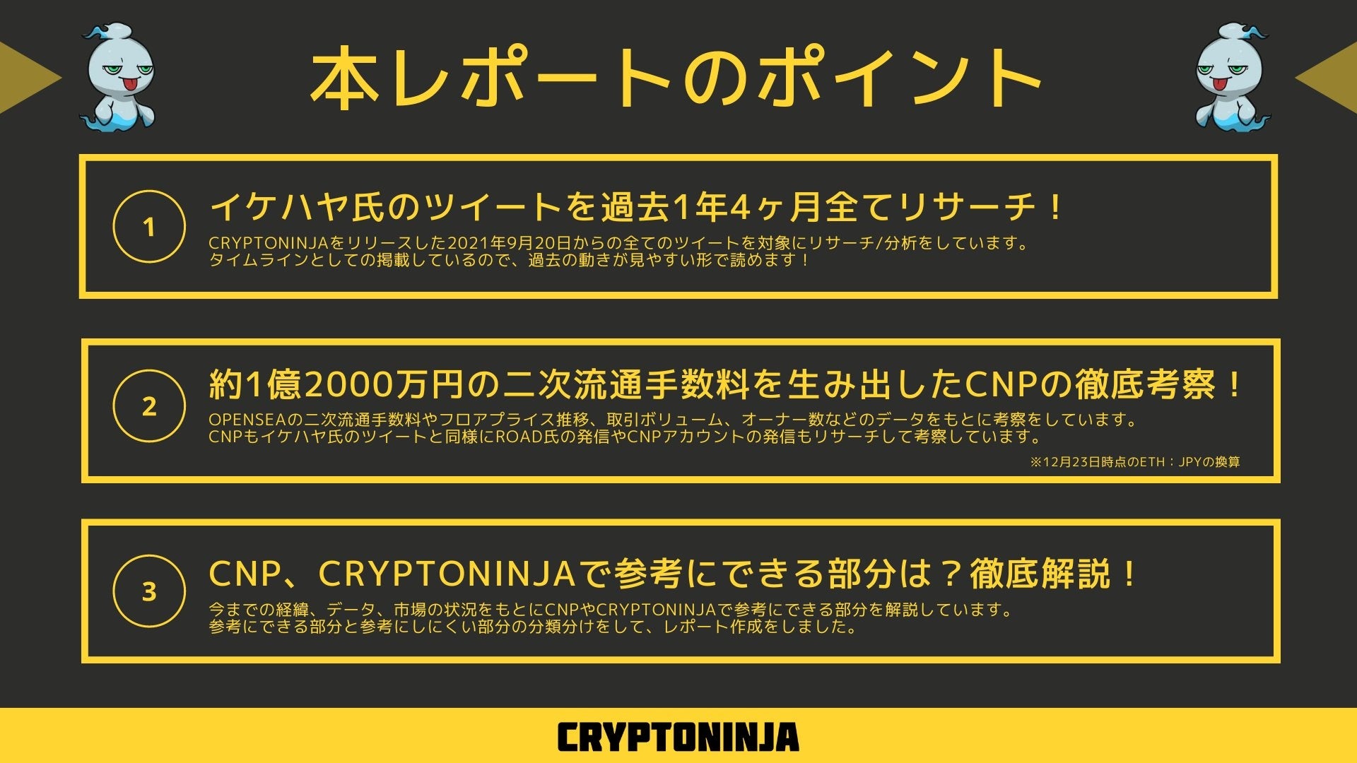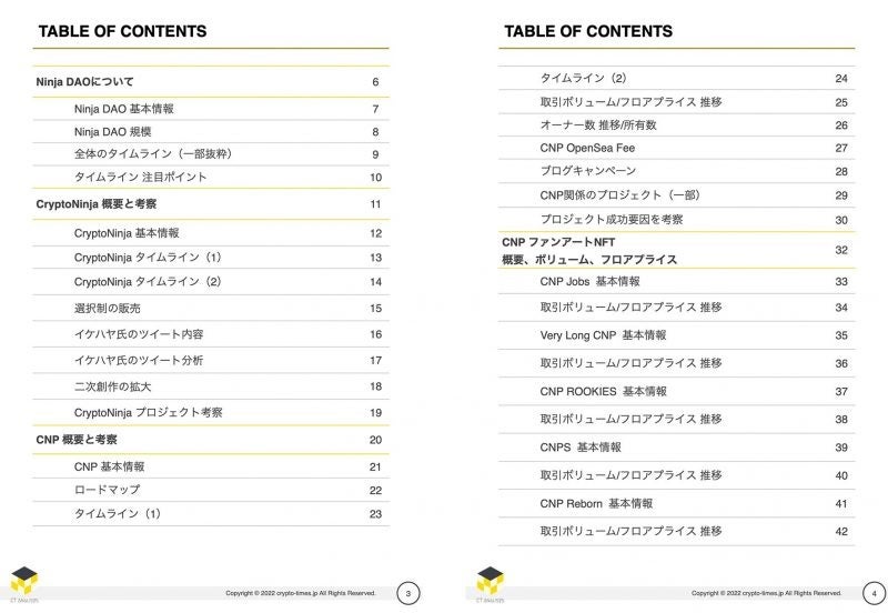 レポート内容のサンプルは、CRYPTO TIMESのTwitter上でも公開した『CNPの成功事例分析とNinja DAO全体概要 レポート概要 』ページよりご確認いただけます。