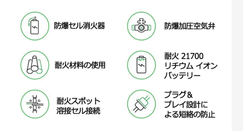 製品の信頼性と安全性を高め、延焼を防ぐためにセル消火器 (CFE) と呼ばれる機能を開発しました。 この機能により、万が一の時でも安心してお使いいただけます。
