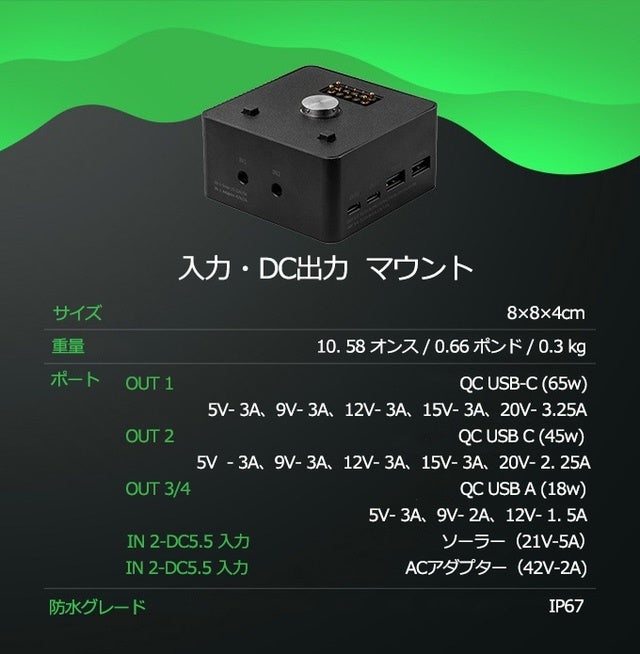 さらに、DC出力マウントの 2つの Type-Cポートは合計 110W (85W & 45W) の出力電力を提供し、AC出力マウントの 1つの Type-C ポートは最大 100Wを提供します。