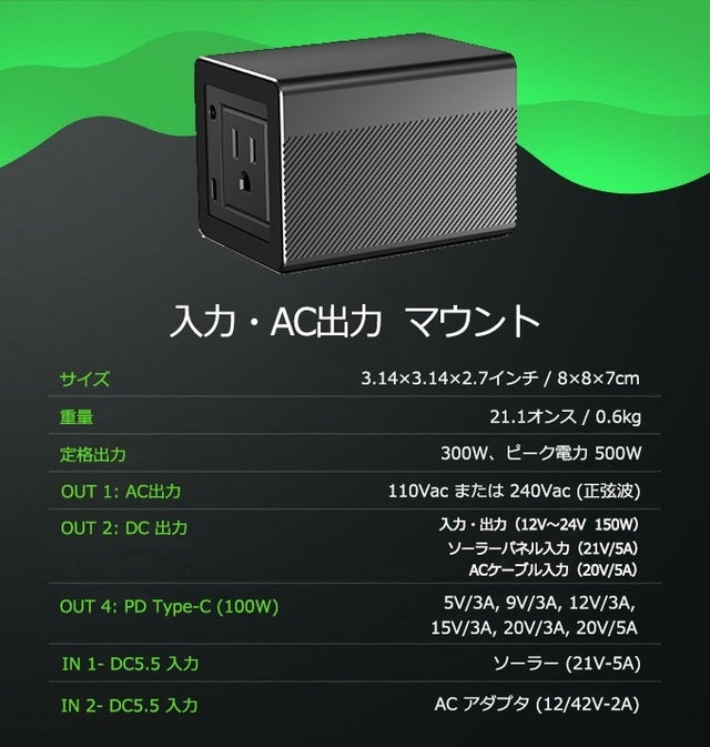 - ピーク電力 600W 高速充電 100W 電力供給