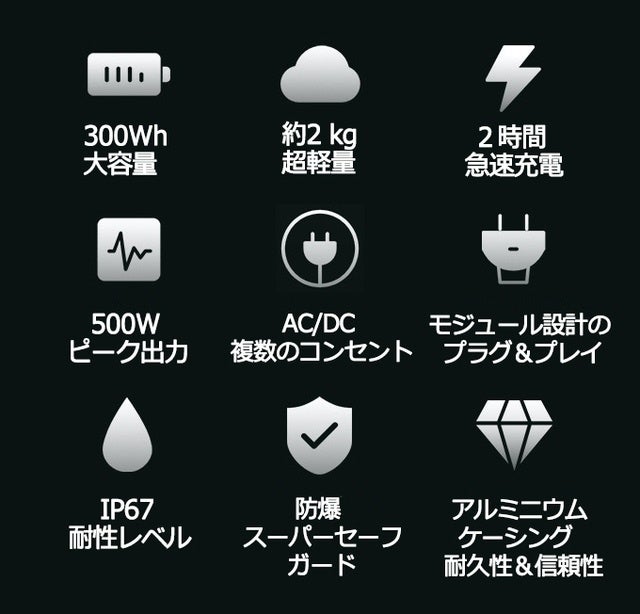IP67ポータブル電源は、USBやAC/DC コンセントで給電されるものを含め、ほとんどのデバイス、ガジェットでご使用いただけます。300Whは、多くの電化製品に電力を供給するのに十分な容量です。