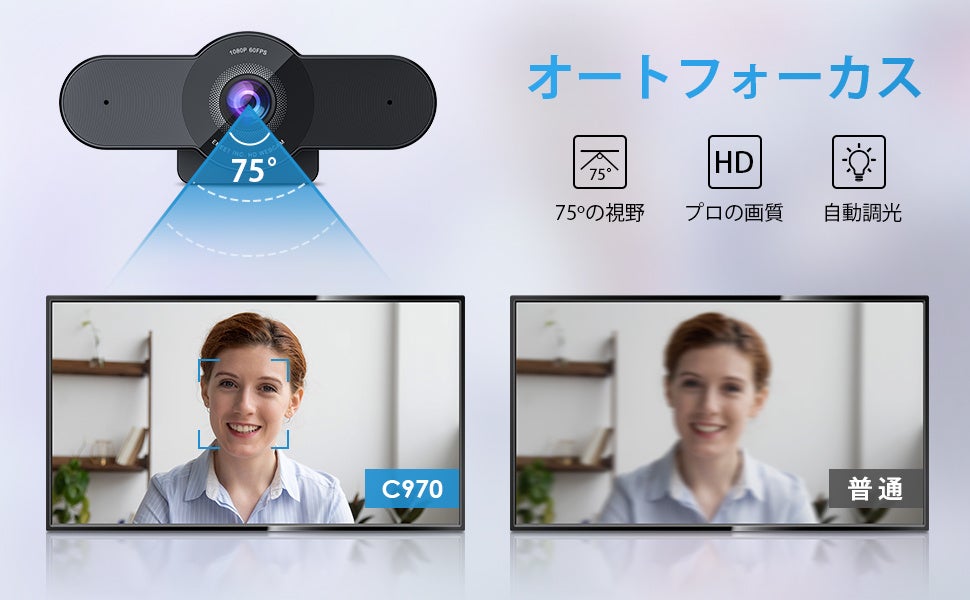 EMEET webカメラはオートフォーカス機能搭載、eMeetLinkソフトウェアで75°~90°調整可能な視野角を備え、個人会議や複数人会議、オンライン授業に最適。それにどんな環境でも画像の明るさのバランスを自動的に調節できます。また、EMEET ウェブカメラC970は鮮明、カラフル、高コントラストの画像を維持しながら、さまざまな画像プリセットを選択することができ、生き生きとした映像をストリーミングのニーズに応じます。
