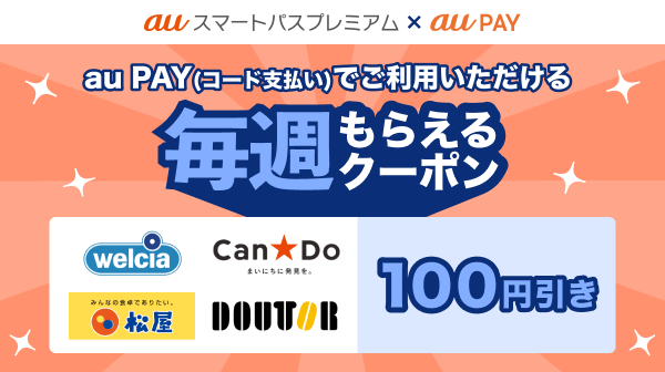 概要:対象の店舗において、au PAYでご利用いただけるクーポンを毎週月曜日にプレゼントします。