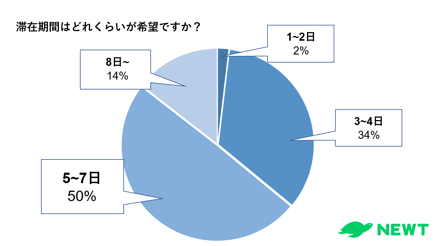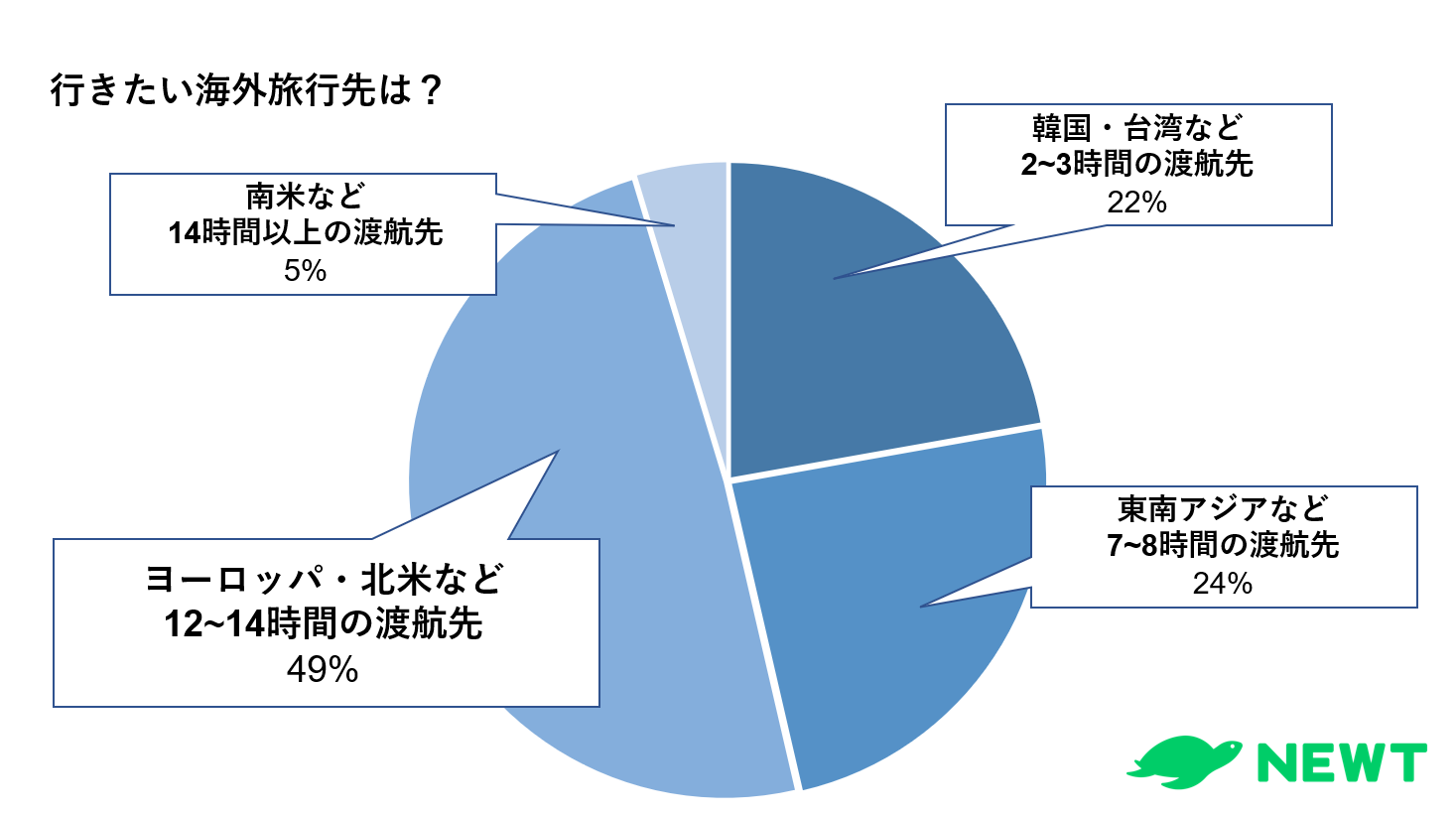 当社が12月に実施した海外旅行に関する意識調査(※1)では、希望の滞在期間に関する質問に対して、「5-7日」と回答した割合が50%といちばん多い結果となりました。また、希望の海外旅行先に関する質問には、「韓国・台湾など2~3時間の渡航先」や、「東南アジアなど7~8時間の渡航先」を抑えて「ヨーロッパ・北米など12~13時間の渡航先」と回答した割合が49%に達しました。