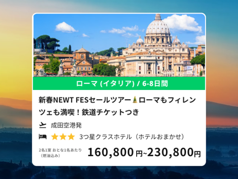 【新春NEWT FES セールツアー】ローマもフィレンツェも満喫!鉄道チケットつき