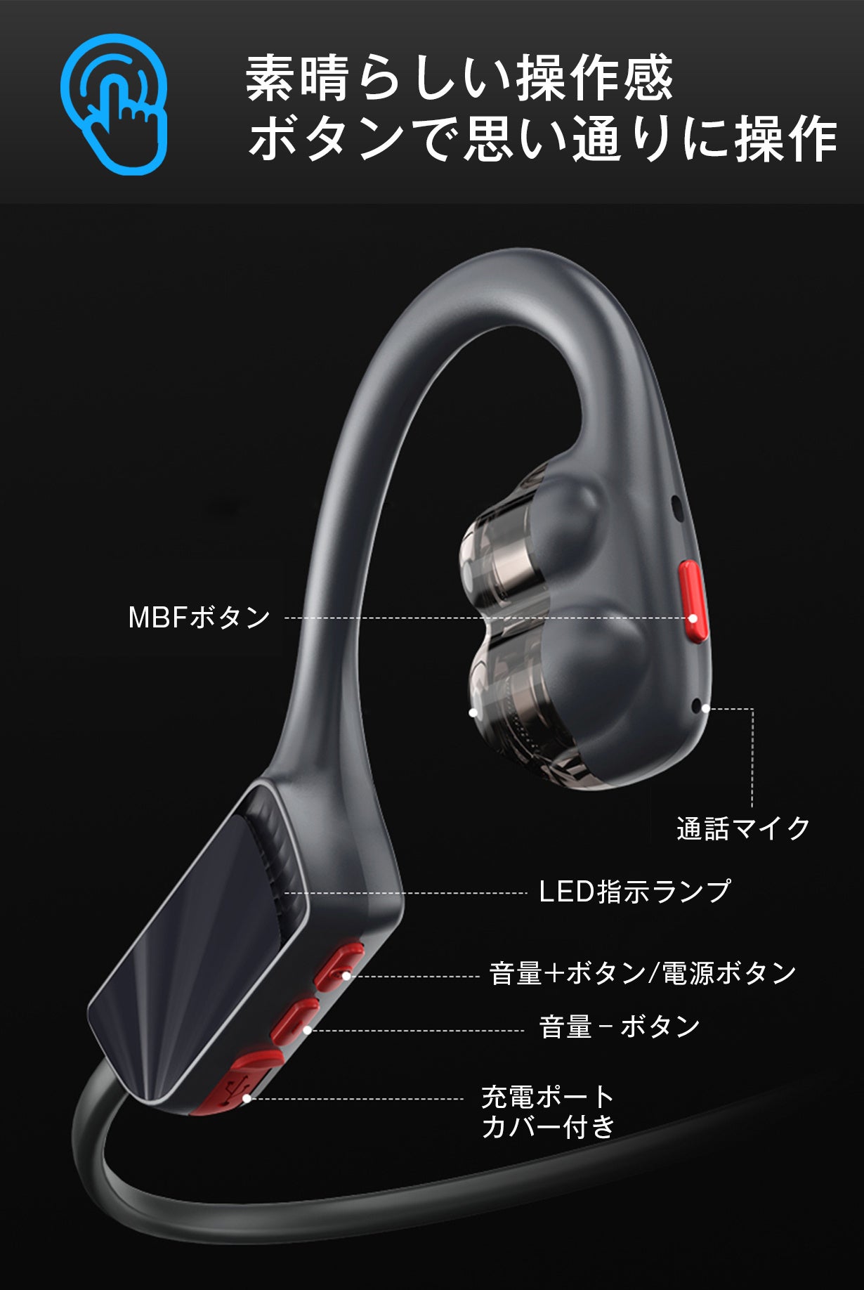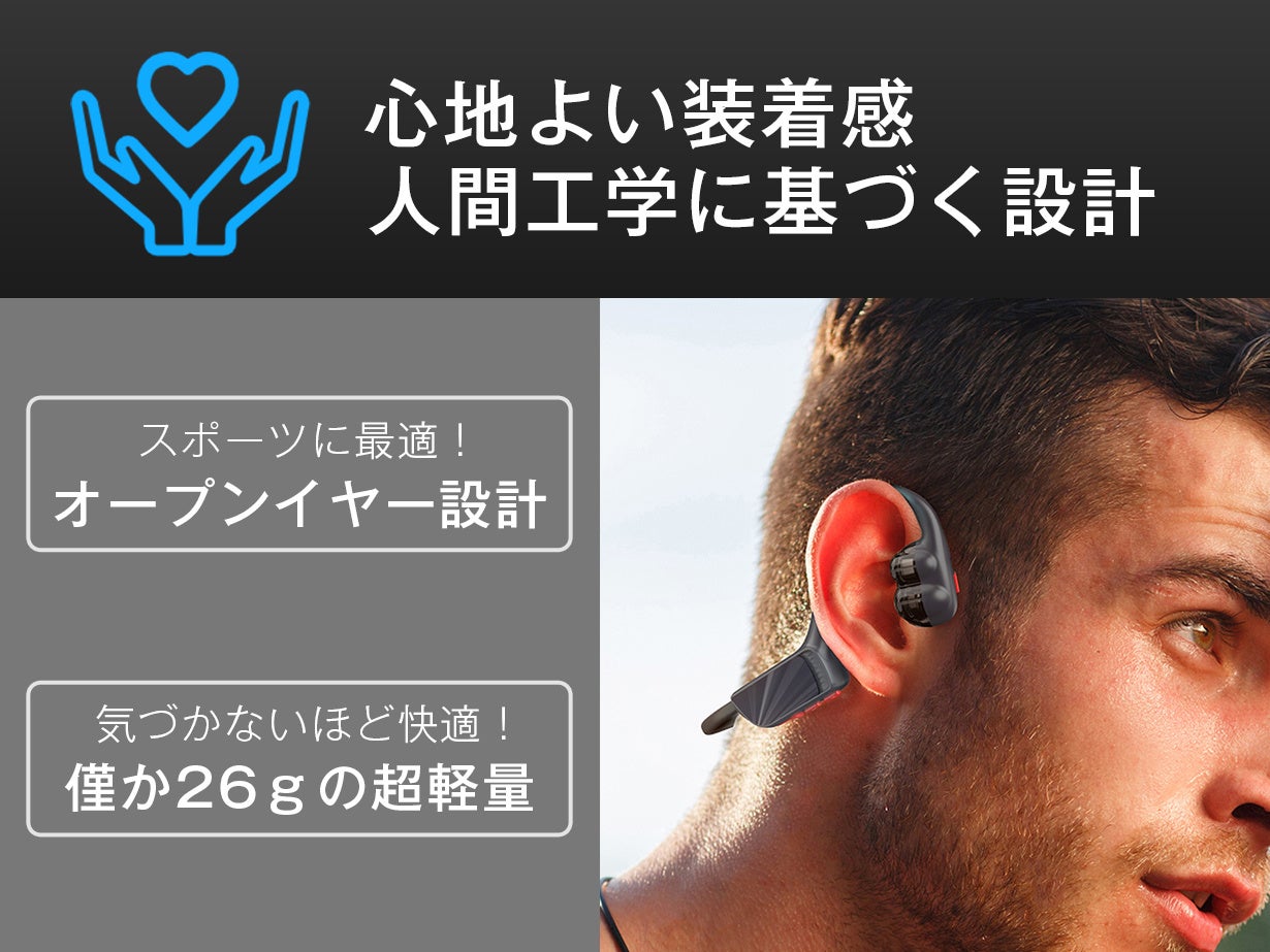 装着は簡単、頭の後ろから両耳にのせるだけ。軽くて落ちにくいイヤーフック型で、耳にぴったりとフィットします。また、耳に圧迫感や閉塞感がなく、耳が蒸れにくいです。本体重量約26gと超軽量で、長時間の装着でもとても快適です。