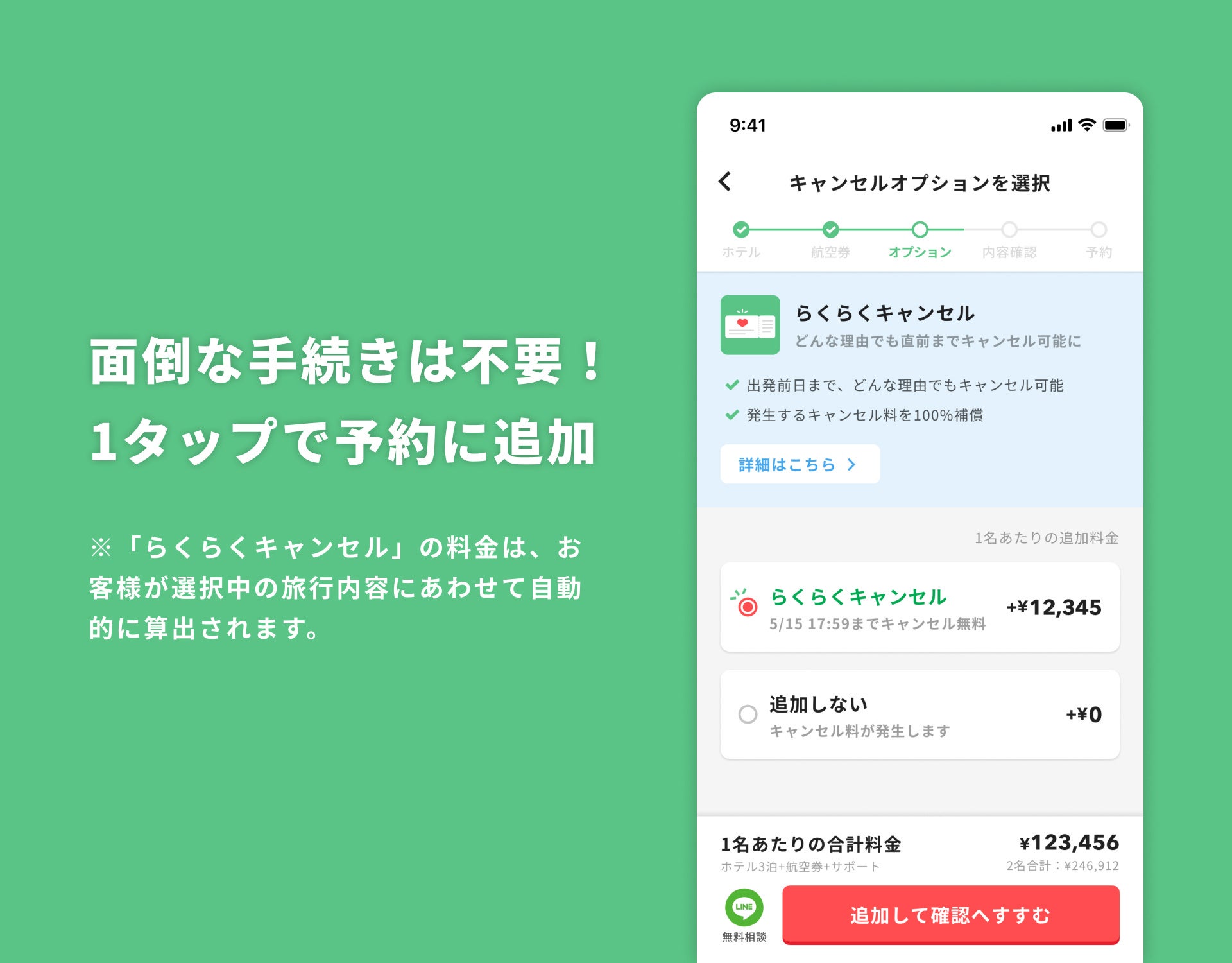 今回提供を開始した《らくらくキャンセル》は、「いつでもキャンセルできるあんしん」によって、海外旅行の予約へのハードルを下げるための機能です。