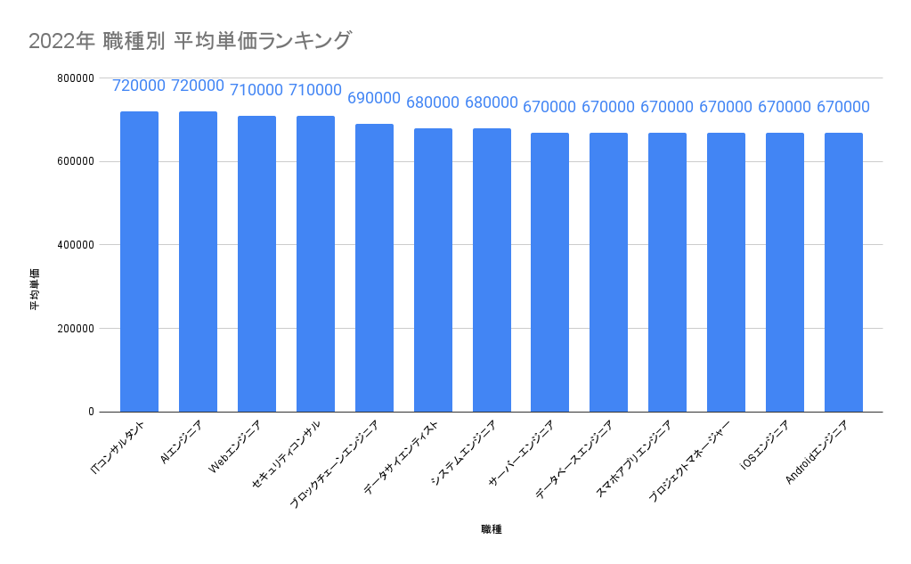 職種別の平均単価では、ITコンサルタント、AIエンジニアが72万円でTOPになりました。