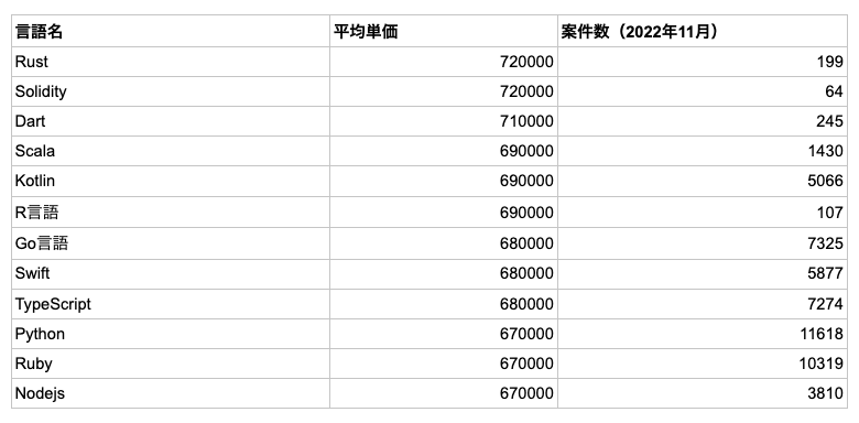 2022年の言語別平均単価では、Rust、Solidityが72万円でTOPになりました。