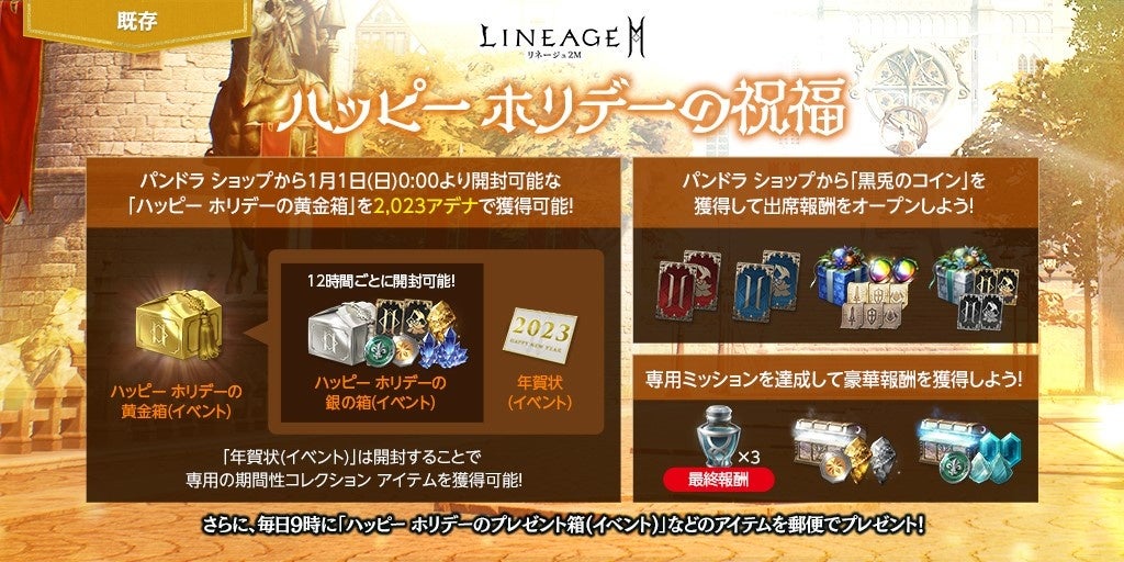さらに、ショップの交換所にて2,023アデナを使用して「ハッピー ホリデーの黄金箱(イベント)」を1個獲得できます。「ハッピー ホリデーの黄金箱(イベント)」をオープン時、「年賀状(イベント)」のほか、「ハッピー ホリデーの銀の箱(イベント)」を14個手に入れることができます。本アイテムを使用することで、「上級クラス/アガシオン獲得券(11回)(イベント)」「上級集魂石(11回)(イベント)」など様々なゲーム内アイテムを獲得できます。「ハッピー ホリデーの銀の箱(イベント)」は使用後12時間が経過すると再度使用することが可能です。