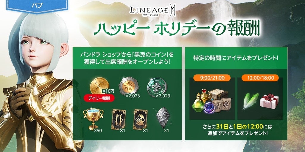 期間中、ショップの交換所にて2,023アデナで交換できる「黒兎のコイン(イベント)」を使用することで出席報酬「ハッピー ホリデー」をオープンすることができます。デイリー報酬として100,000アデナを獲得することができるほか、「上級クラス/アガシオン獲得券(6回)(イベント)」などのアイテムを獲得することができます。