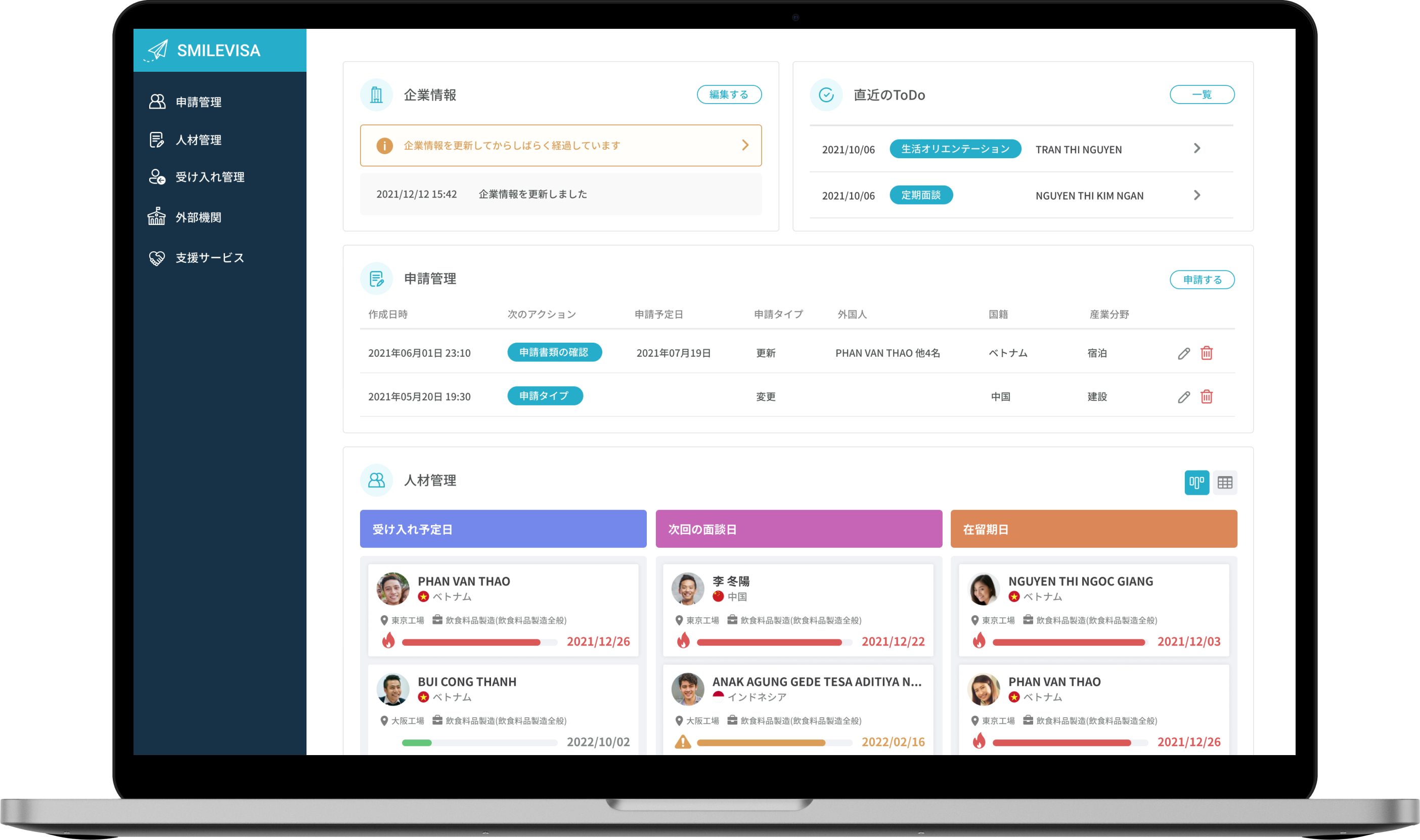 SMILEVISAは、特定技能の管理業務をより円滑に行うことを目的としたサービスであり、外国人の自社受入れを希望する企業をサポートします。