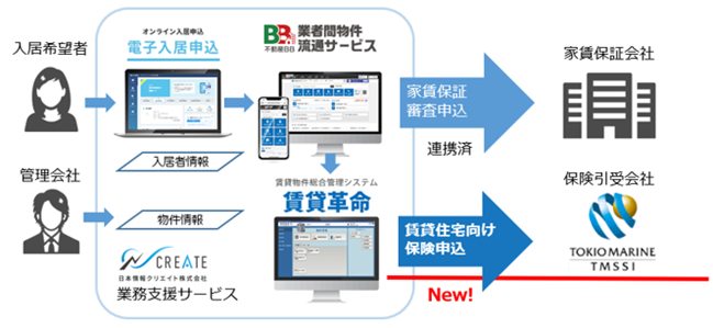 入居申込をオンラインで完結する日本情報クリエイトの「電子入居申込サービス」から取込まれた入居者情報と、不動産管理会社様がシステム上で管理する物件情報を東京海上ミレア、東京海上ウエストの保険システムに連携します。これにより東京海上ミレア、東京海上ウエストの家財保険をご利用いただく入居希望者様、管理会社様は従来の一般的な手続きと異なり、手作業での保険申込の手間や記載漏れ確認などのストレスが少ない、スムーズな保険申込が可能となります。