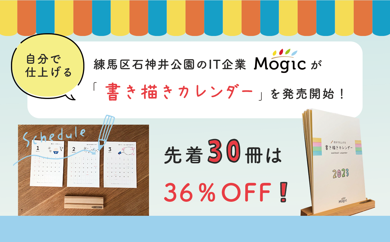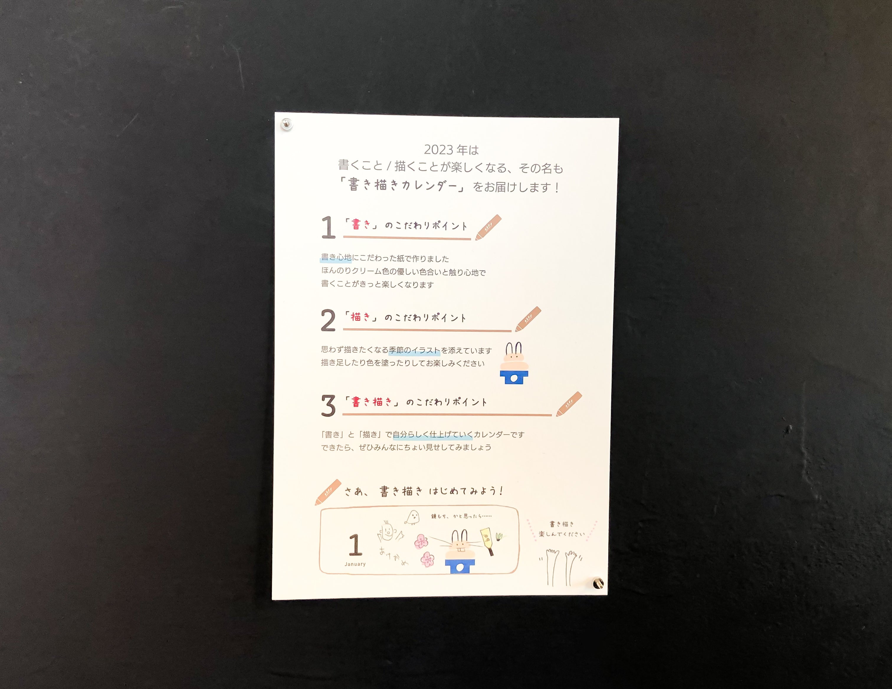 Mogicストアオープン記念すべき第一弾は、書くこと/描くことが楽しくなる「書き描きカレンダー」です。書き心地にこだわった紙を選び、お絵描きしたくなるような季節のイラストを添えて、自分らしく仕上げていくカレンダーを作り上げました。