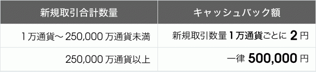 ・新規取引合計数量が500万通貨 ⇒ 1,000円キャッシュバック