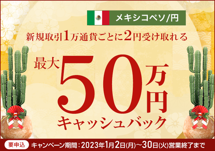 キャンペーンに申し込まれたお客さまに、期間中におけるメキシコペソ/円の新規取引合計数量に応じて、最大500,000円をキャッシュバックします。
